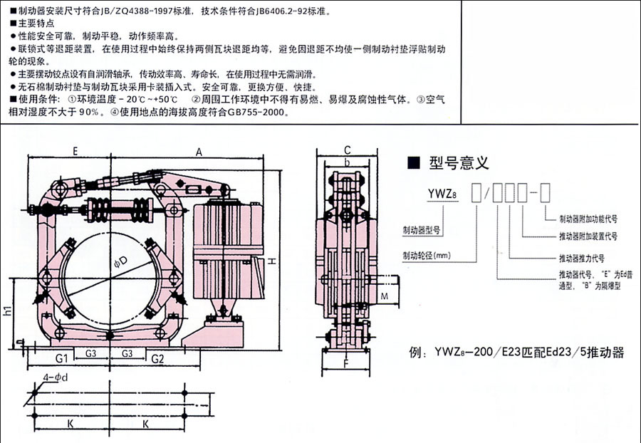 YWZ8系列電力液壓制動器YWZ8系列電力液壓塊式制動器:YWZ8-200/23;YWZ8-200/30;YWZ8-300/30;YWZ8-300/50;YWZ8-300/80;YWZ8-400/50;YWZ8-400/80;YWZ8-400/121;YWZ8-500/121;YWZ8-500/201;YWZ8-600 ......